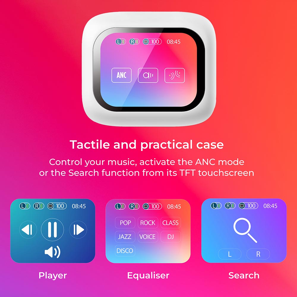 Gli auricolari KSIX Vision offrono un controllo completo di musica e chiamate grazie al display TFT multi-touch da 2,01’’ integrato nella custodia. Questo permette di accedere facilmente a funzionalità come equalizzatori, assistenti vocali e ricerca integrata, oltre a personalizzare lo sfondo con quadranti disponibili.