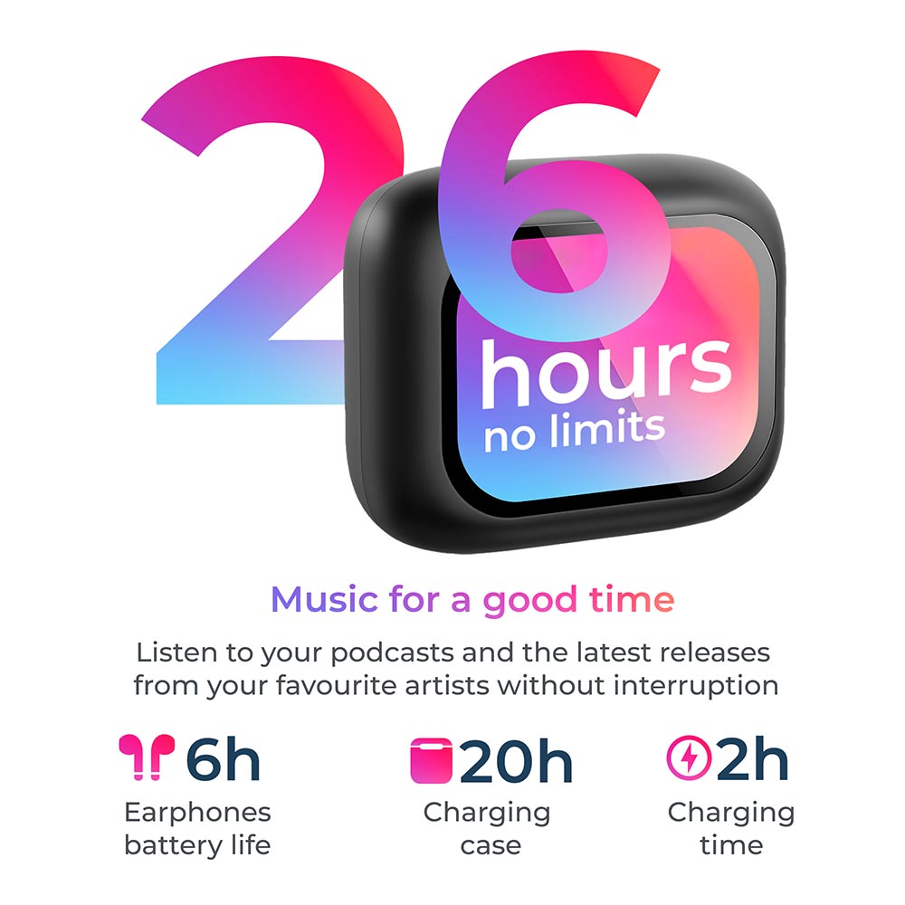 Con 6 ore di autonomia negli auricolari e ulteriori 20 ore fornite dalla custodia di ricarica, raggiungono un totale di 26 ore di utilizzo continuo. Ideali per lunghi viaggi o giornate intense.