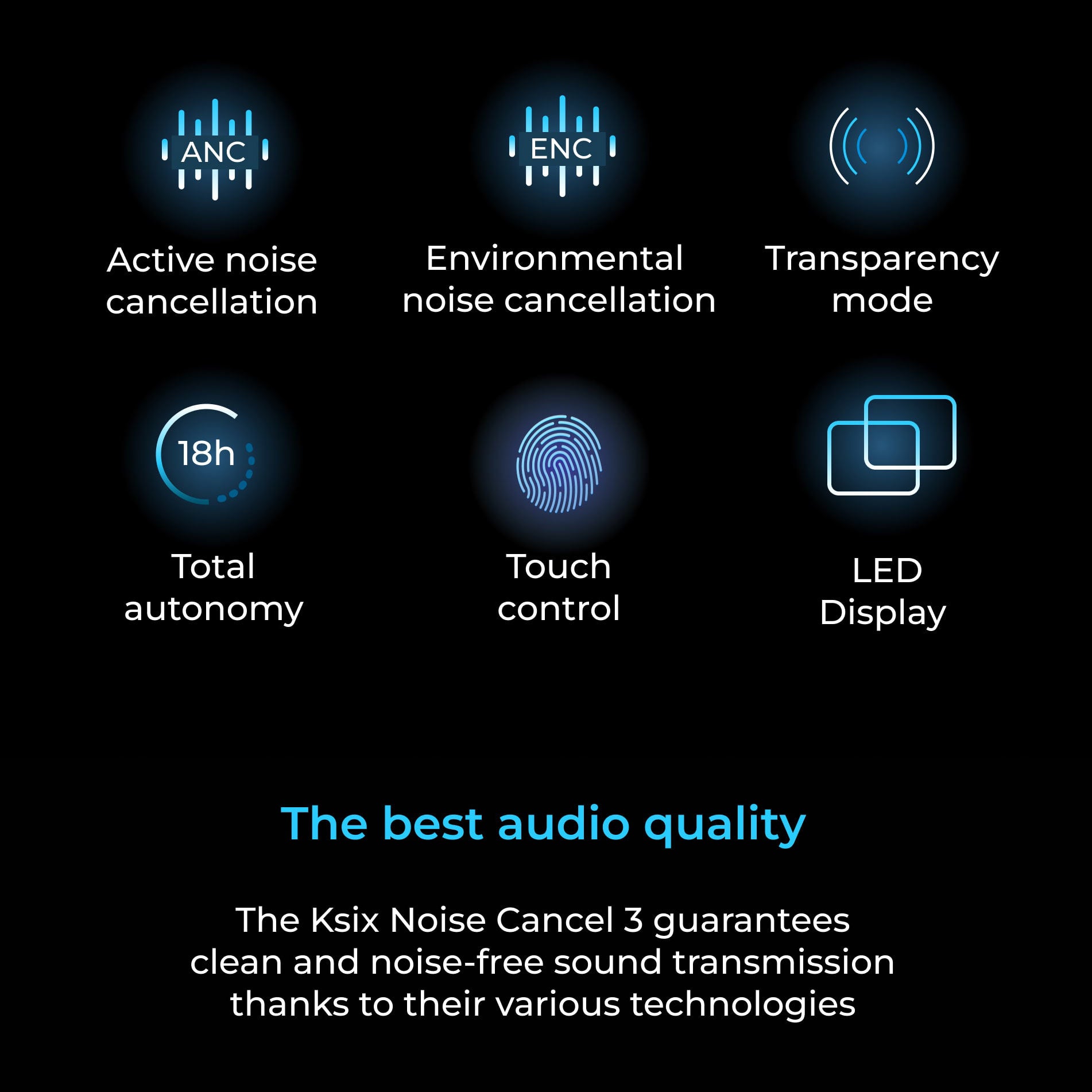Gli auricolari KSIX Noise Cancel 3 offrono un’esperienza audio di alto livello grazie a tecnologie avanzate che si adattano alle diverse esigenze dell’utente. La cancellazione attiva del rumore (ANC) permette di isolarsi completamente dai rumori esterni per immergersi in musica, film o chiamate, mentre la ENC elimina i disturbi ambientali per una qualità superiore nelle conversazioni. La modalità Trasparenza consente di ascoltare i suoni circostanti senza dover rimuovere gli auricolari, ideale per situazioni dinamiche.