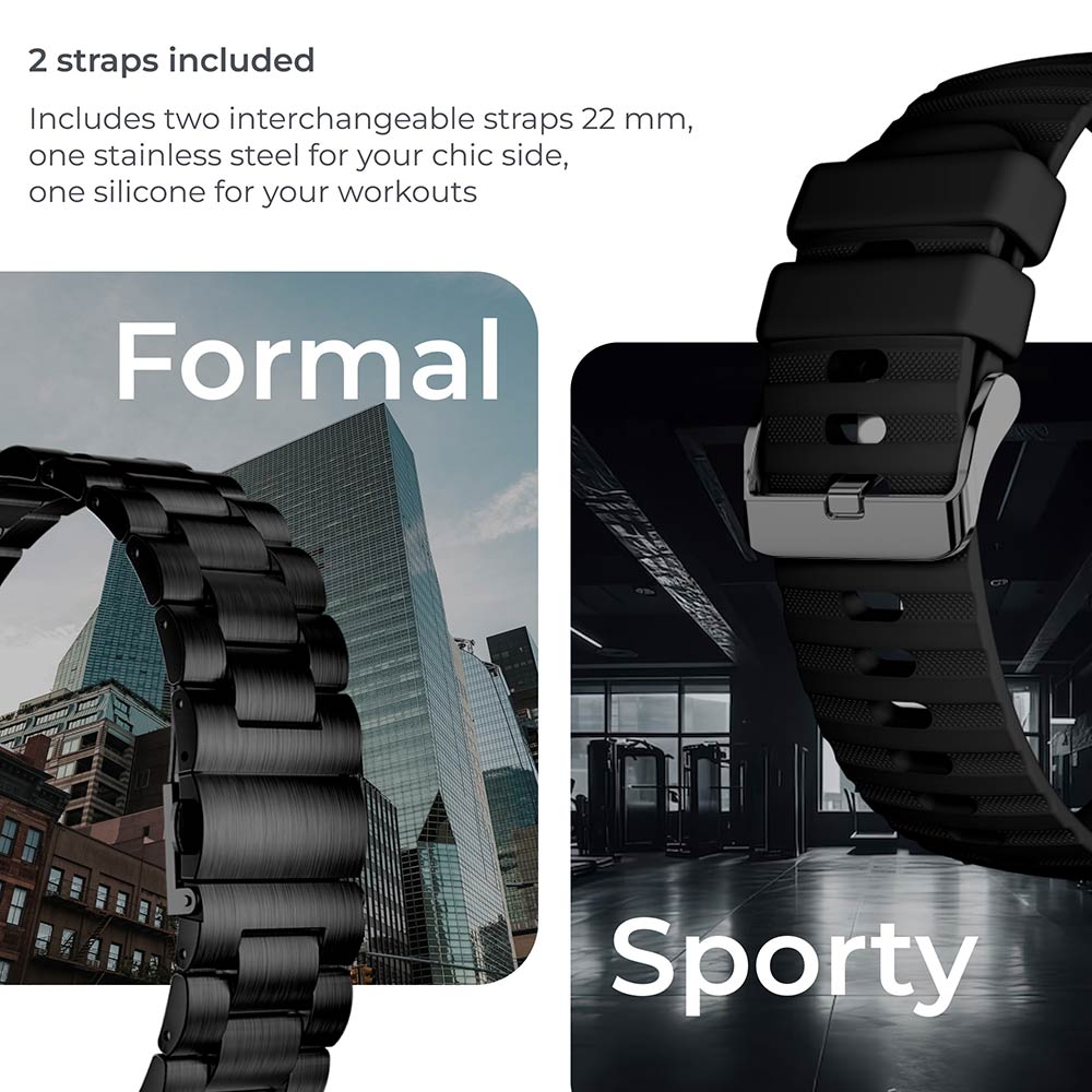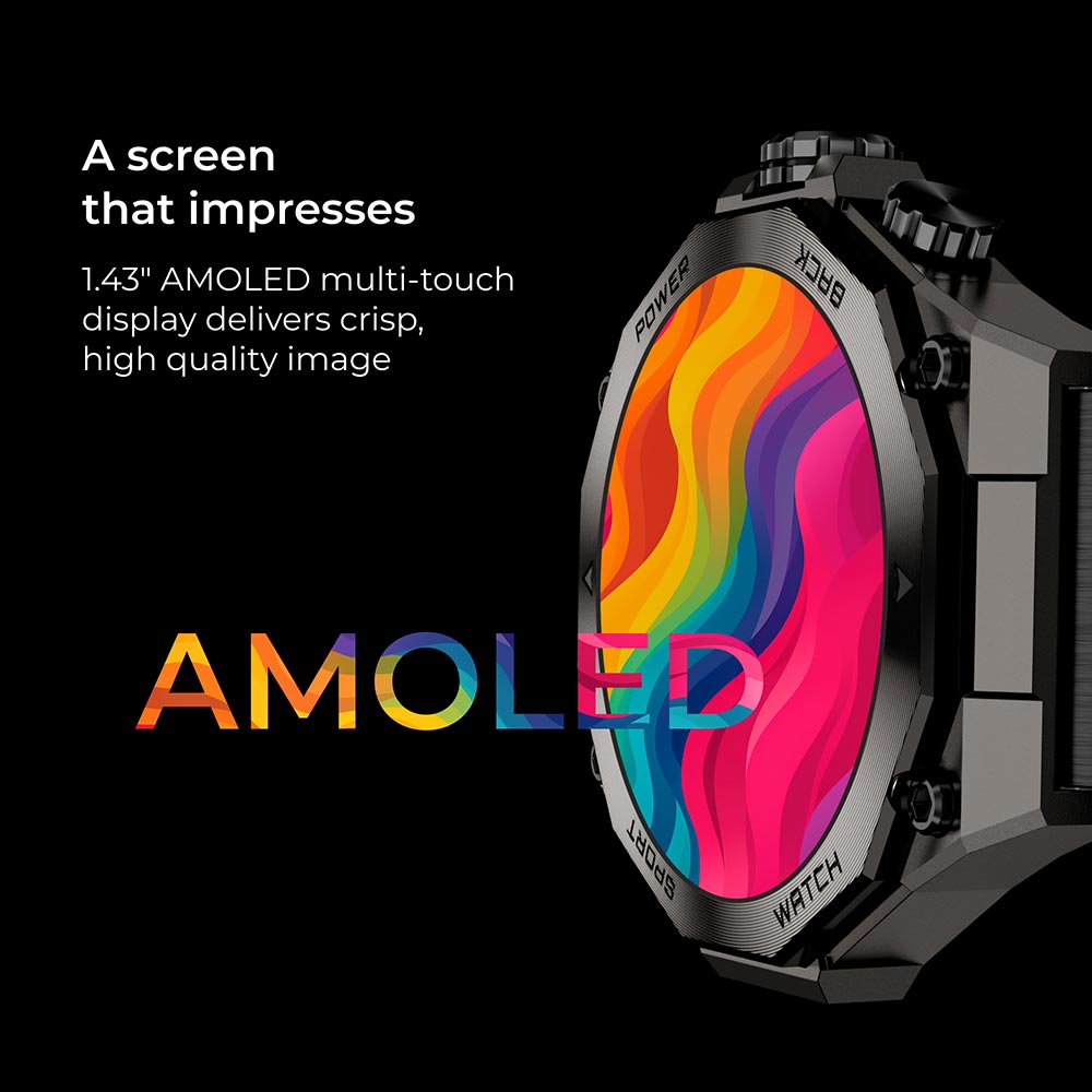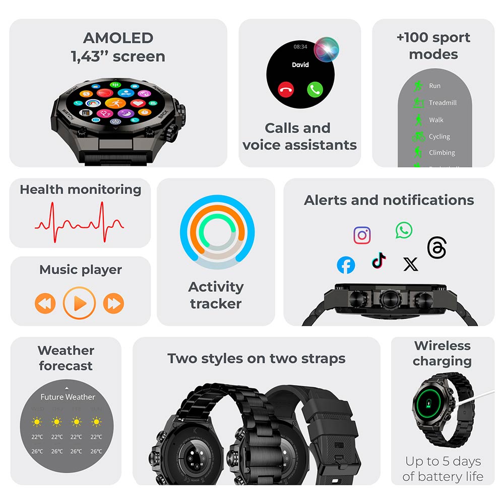 Lo smartwatch Titanium offre un’esperienza visiva eccezionale grazie al suo display AMOLED multi-touch da 1,43”, con risoluzione 466 x 466 pixel, immagini nitide e colori vividi. È dotato di due cinturini intercambiabili: uno sportivo in silicone e uno elegante in acciaio inox, che permettono di adattare lo stile dell’orologio a qualsiasi occasione, dal look casual per l’uso quotidiano a quello raffinato per eventi speciali.