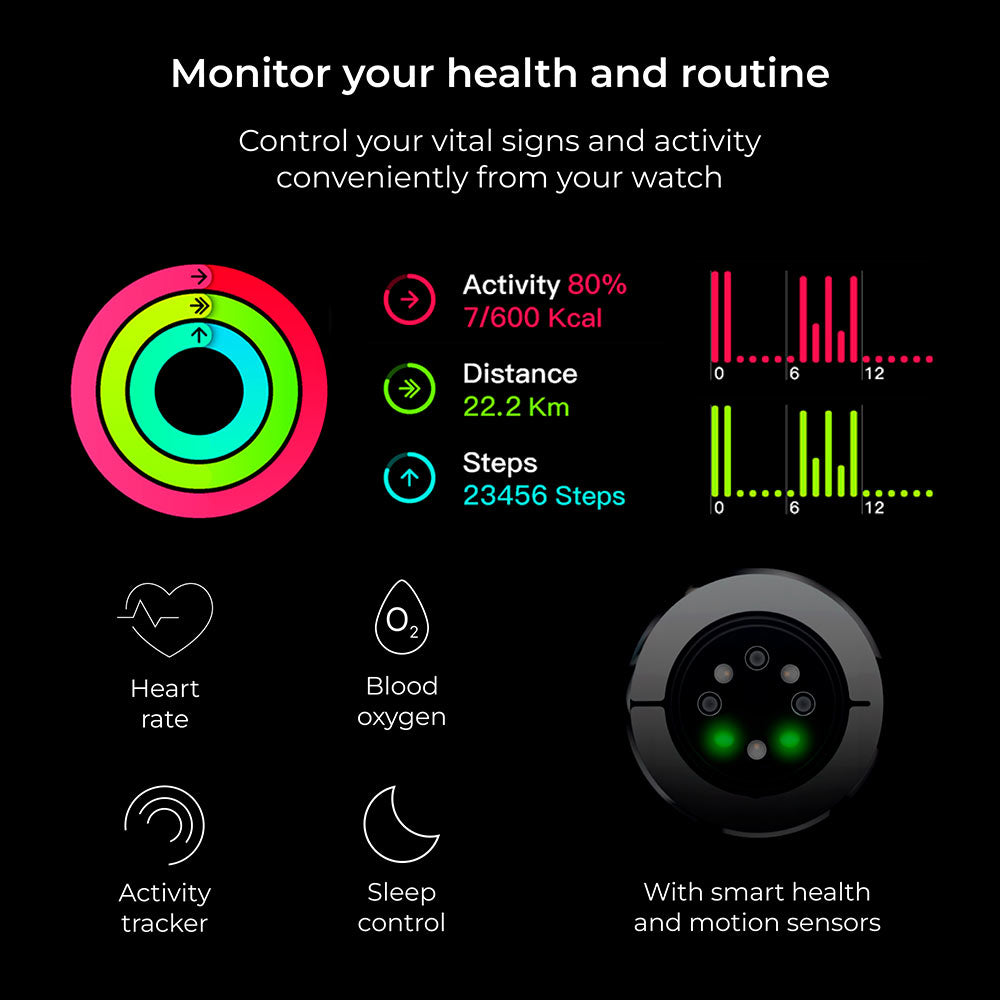 Il Titanium è ideale per chi vuole monitorare la propria salute e mantenere uno stile di vita attivo. I sensori integrati permettono di tenere sotto controllo frequenza cardiaca, pressione sanguigna, livello di ossigeno nel sangue e qualità del sonno, oltre a contare passi, calorie bruciate e distanza percorsa. Con oltre modalità sportive personalizzate, registra tutte le attività fisiche.